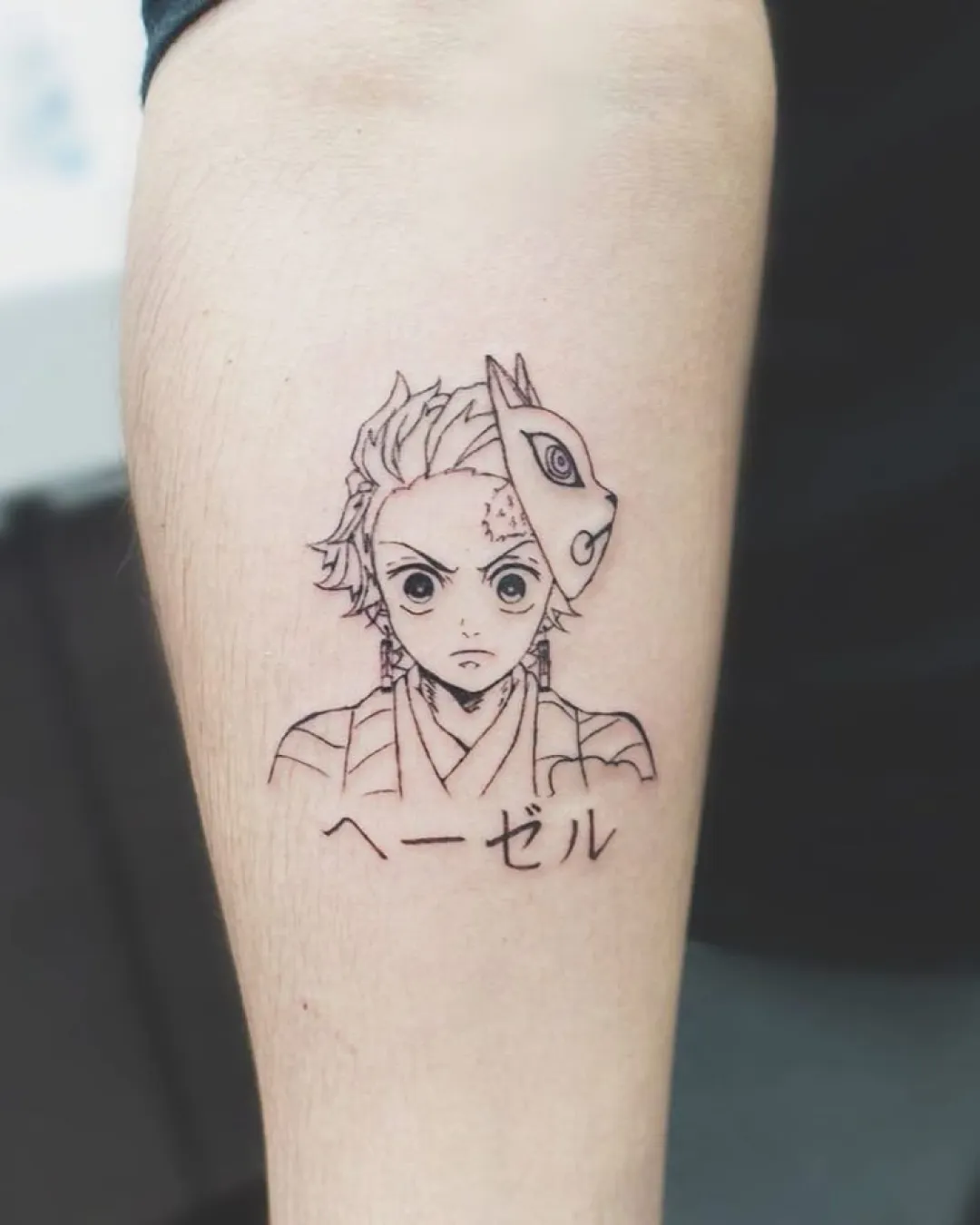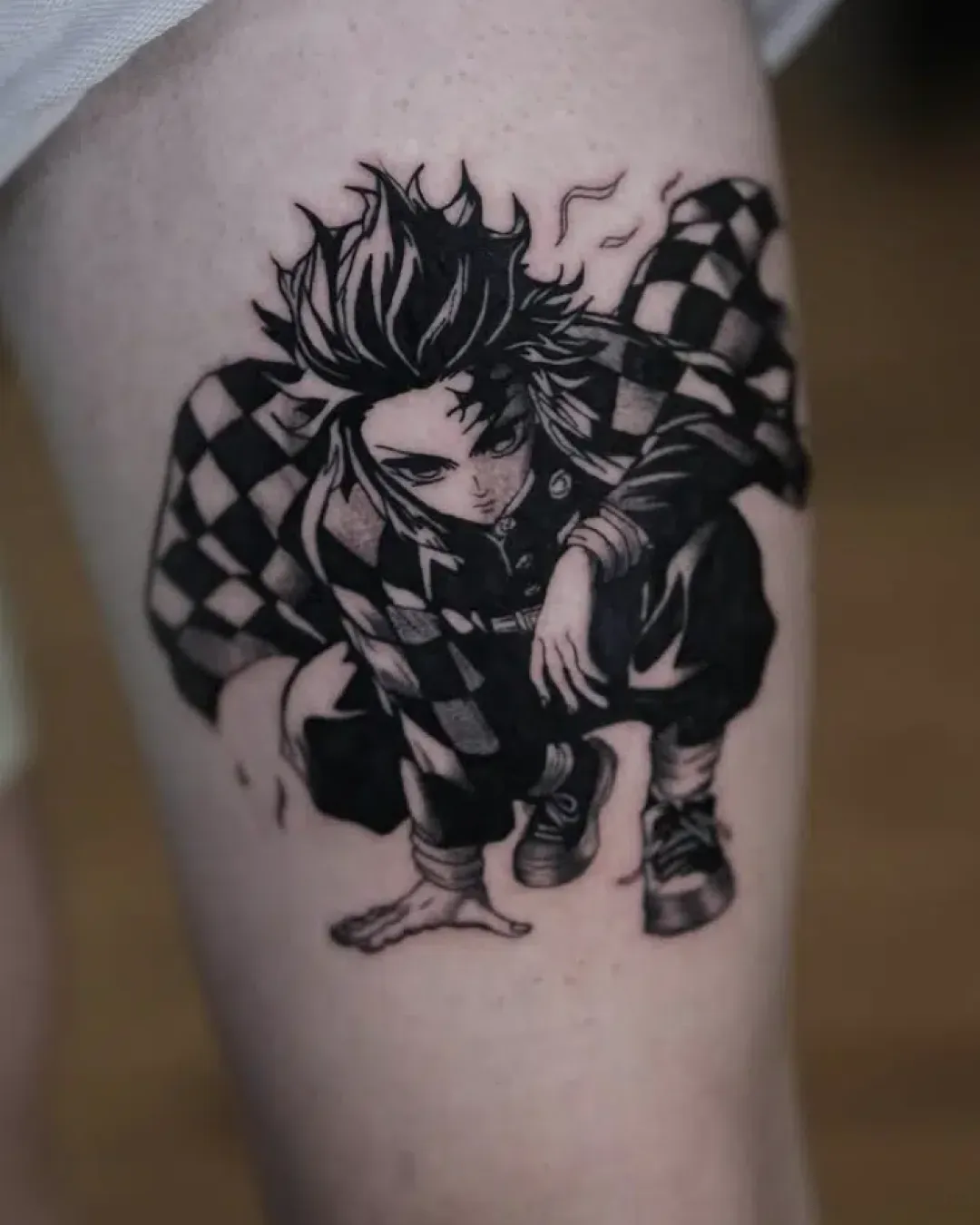 Tanjiro represents the heart of Demon Slayer. His tattoos embody perseverance, family bonds, and the journey from tragedy to strength. You’ll see his distinctive forehead scar, checkered green-and-black haori, and water breathing techniques dominating designs. Many choose Tanjiro because he symbolizes overcoming impossible odds through discipline and compassion.