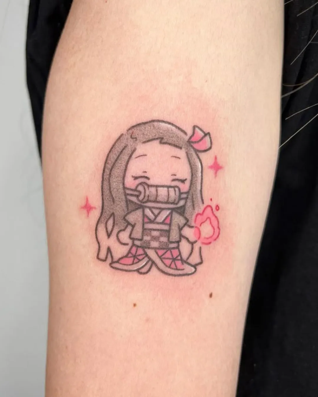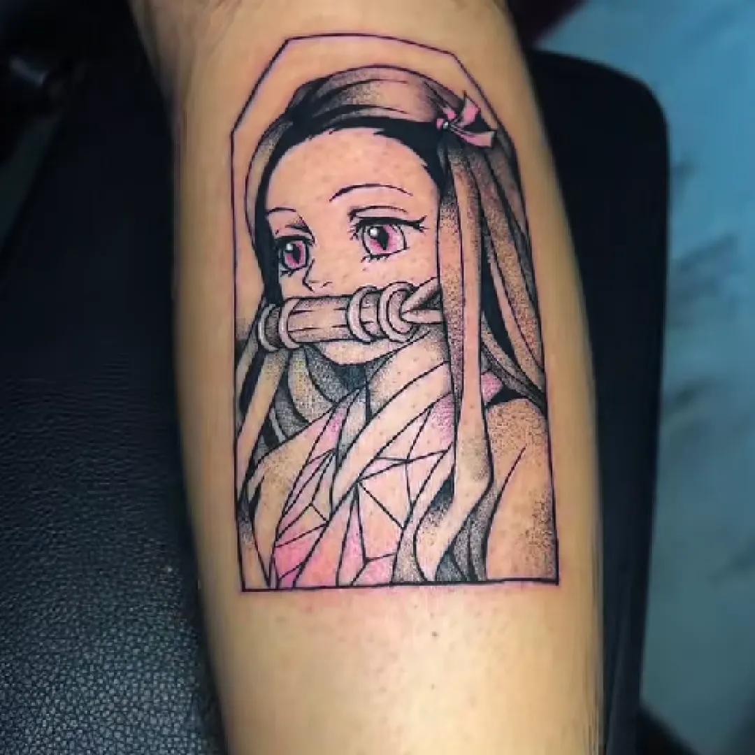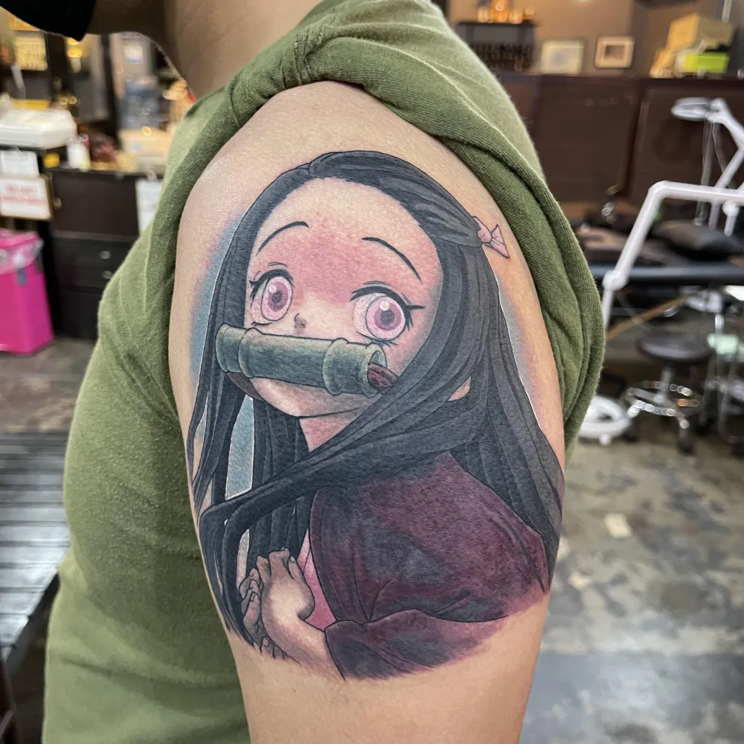 The contrast between her black hair, pale skin, bright pink clothing, and green bamboo muzzle gives artists multiple color zones to work with. Skilled tattooists can make her eyes glow with an otherworldly orange-pink hue, capturing her demonic nature while maintaining her gentle spirit.
