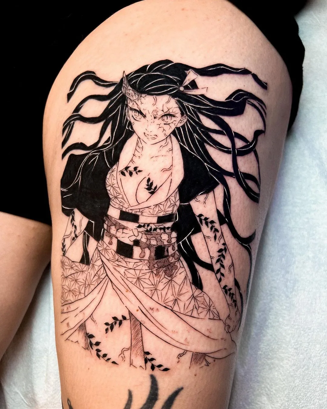 Monochromatic Nezuko tattoos excel at capturing emotion. Her protective stance over Tanjiro, the moment she shrinks into her box, or her fierce demon form defending her brother—all these scenes gain impact through dramatic shading rather than color.